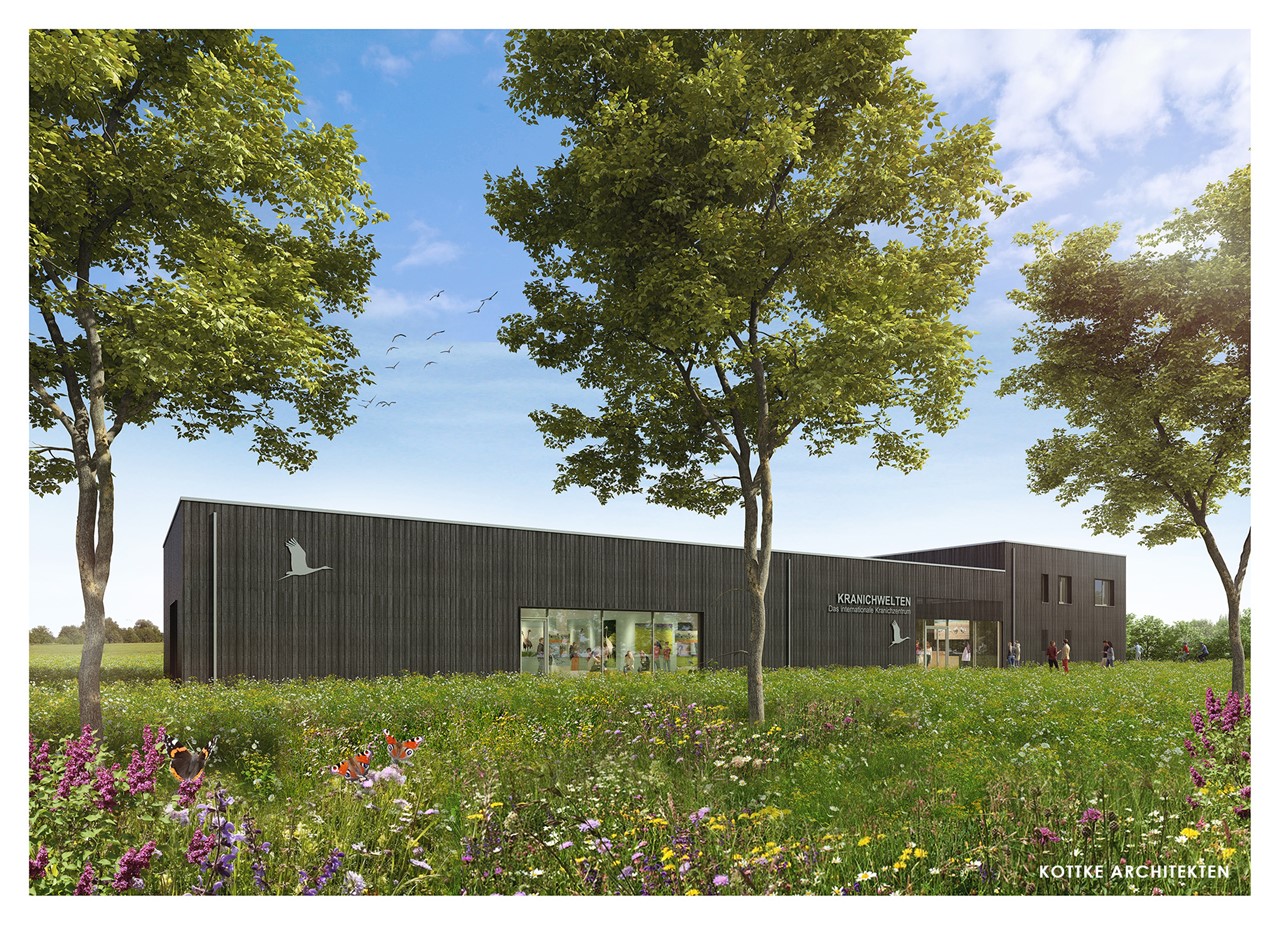 Therefore, the Kranichschutz Deutschland gGmbH in sponsorship of the NABU e.V. is aiming to establish a new unique International Crane Centre in Germany to provide information on climate protection and biodiversity. The New International Crane Centre will be a travel destination for all crane lovers in Europe. The centre’s exhibition is supposed to take visitors to a new environment and inspire them.
